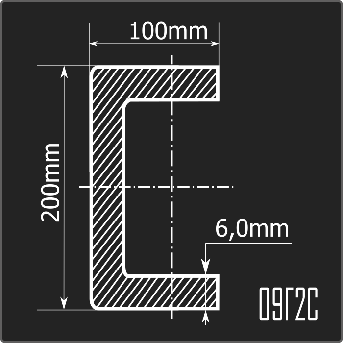 Швеллер стальной холоднокатаный гнутый равнополочный 200*100мм, толщиной 6,0мм и длиной 12м. Материал - низколегированная сталь. Соответствует требованиям ГОСТ 19281-2014.