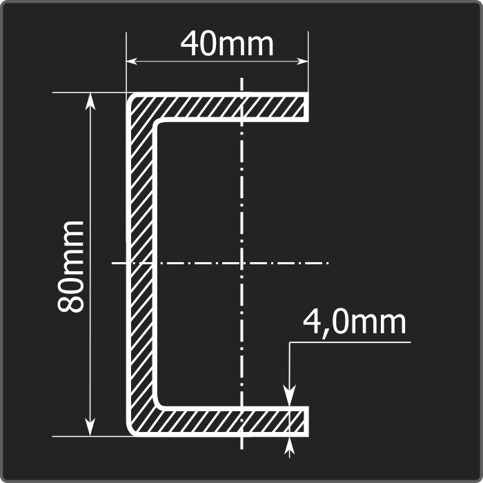 Швеллер стальной холоднокатаный гнутый равнополочный 80*40мм, толщиной 4,0мм и длиной 12м. Материал - углеродистая сталь. Соответствует требованиям ГОСТ 8278-83.
