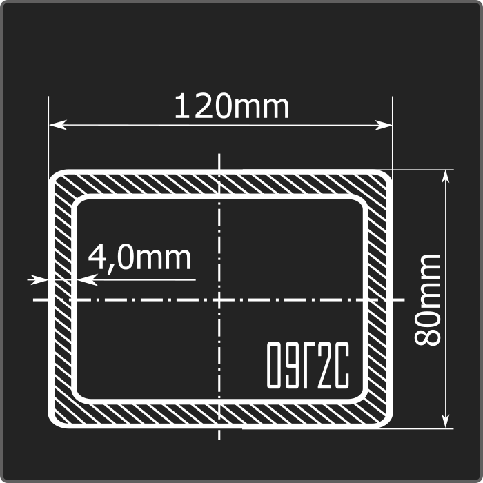 Труба профильная стальная прямоугольного сечения 120*80мм, длиной 12м и толщиной 4,0мм. Материал - низколегированная сталь. Соответствует требованиям ГОСТ 30245-2003.
