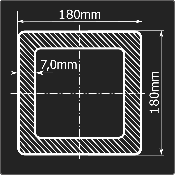 Труба профильная стальная квадратного сечения 180*180мм, длиной 12м и толщиной 7,0мм. Материал - углеродистая сталь. Соответствует требованиям ГОСТ 30245-2003.