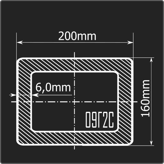 Труба профильная стальная прямоугольного сечения 200*160мм, длиной 12м и толщиной 6,0мм. Материал - низколегированная сталь. Соответствует требованиям ГОСТ 30245-2003. Стандартный пакет: вес - 3,462тн., количество - 9шт.